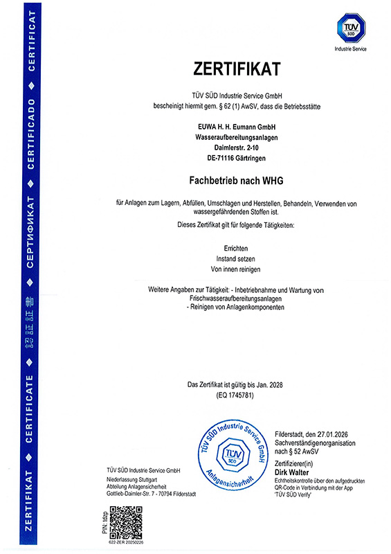EUWA ist zertifizierter Fachbetrieb nach §62 AwSV